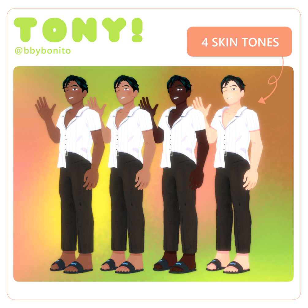 Tony! My first avatar for sale on BOOTH. Optimized for Quest and PC with skin colour toggles and many expressions.